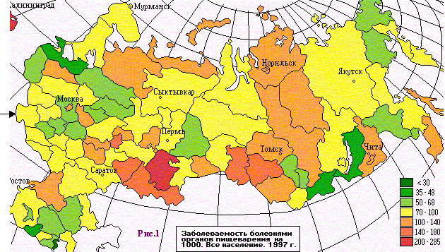 Введение: В группе «болезни органов пищеварения» сейчас выделяют около 70 основных и более 150 редко встречающихся нозологических единиц и синдромов. В МКБ болезни органов пищеварения помещены в два класса: девятый - К00-К93, в основном это воспалительные, инфекционно-аллергические, дисрегенераторные заболевания; второй - С15-С26, опухоли органов пищеварения и несколько групп - О00-О99, аномалии, деформации; S00-Т98 - травмы и последствия воздействия внешних причин. Как видно из рис.1 болезни органов пищеварения весьма распространены в России. В ЦЧО регионе они регистрируются у каждого седьмого человека.