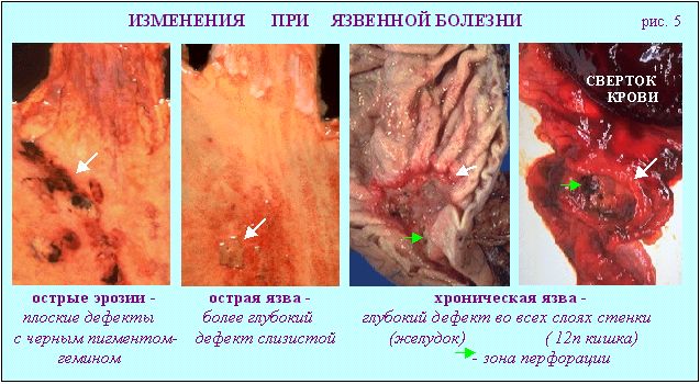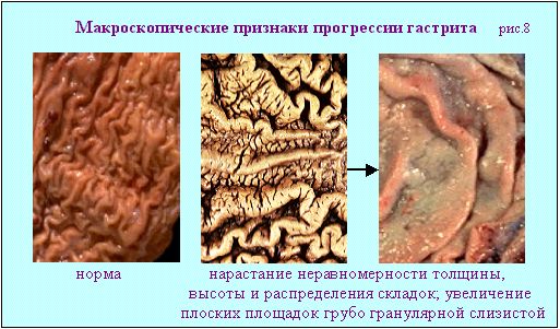 Для язвенной болезни характерна смена фаз ремиссии и обострения. Морфология биопсий получаемых при фиброскопиях позволяет объективно оценивать течение язвенной болезни(рис. 6).