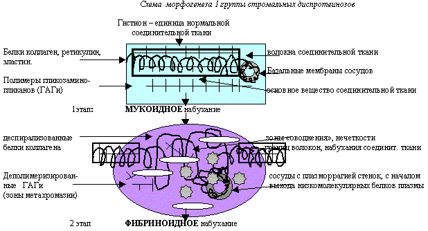2 - фибриноидное набухание приводящее к возникновению ФИБРИНОИДА (в-ва